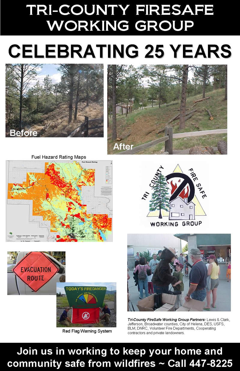 This year marks the 25th anniversary of the Tri-county FireSafe Working Group, established by Sonny Stiger in 1984 after the North Hill Fire burned both private and public land near Helena, Montana. Tri-county members include individual citizens; local, state and federal government agencies; private contractors; fire suppression, DES and planning departments and other interested parties in Broadwater, Jefferson and Lewis & Clark counties.